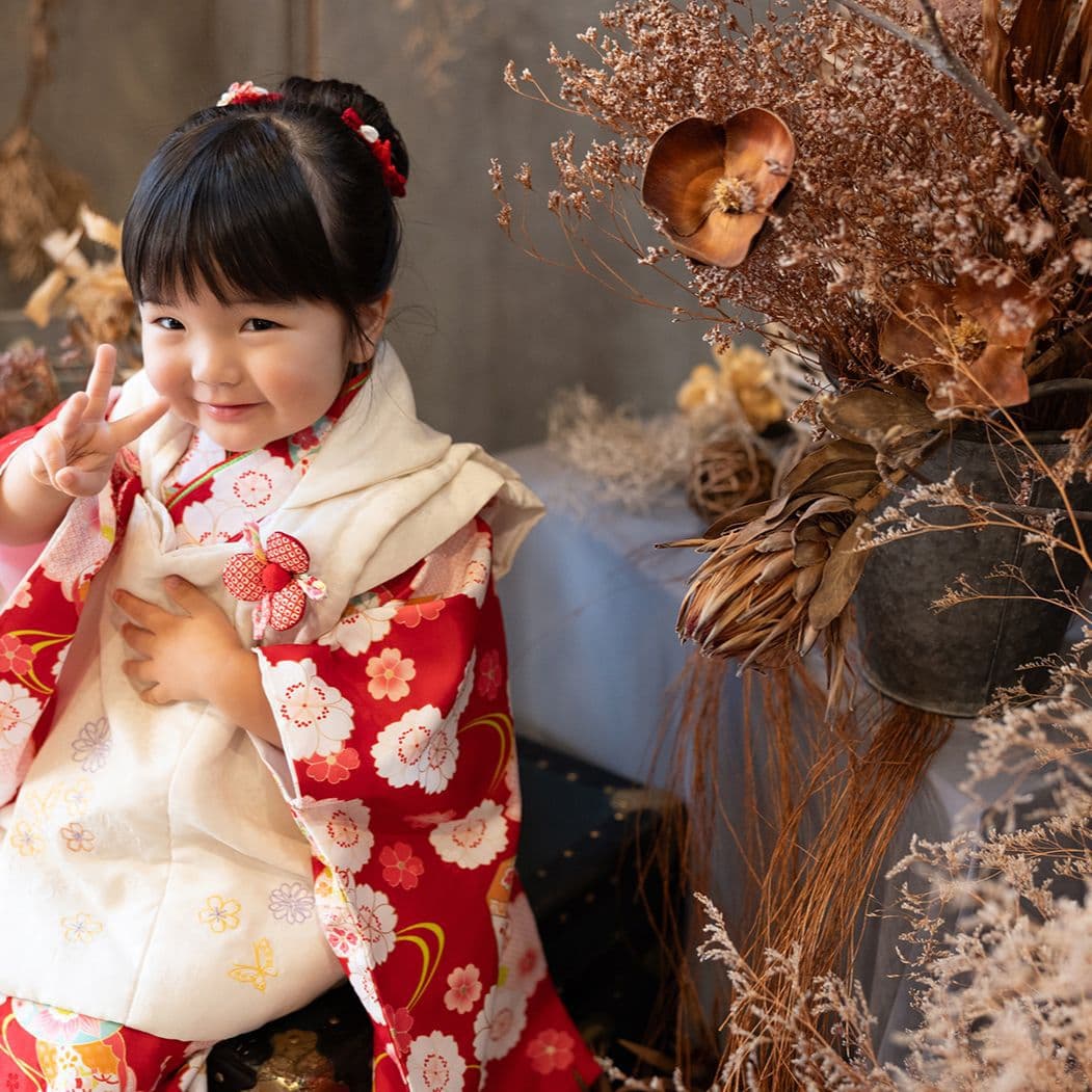 不洗観音寺より200mとお宮参り、百日記念、七五三のお参りと撮影をお子様、パパ、ママの疲れを軽減し1日で行うことが出来ます。ドライフラワーとアンティク家具で構成されたスタジオ撮影はもちろん倉敷美観地区などでのロケーションフォトも人気です。バースデーフォトやマタニティフォト、成人式の振袖レンタル撮影も人気です。