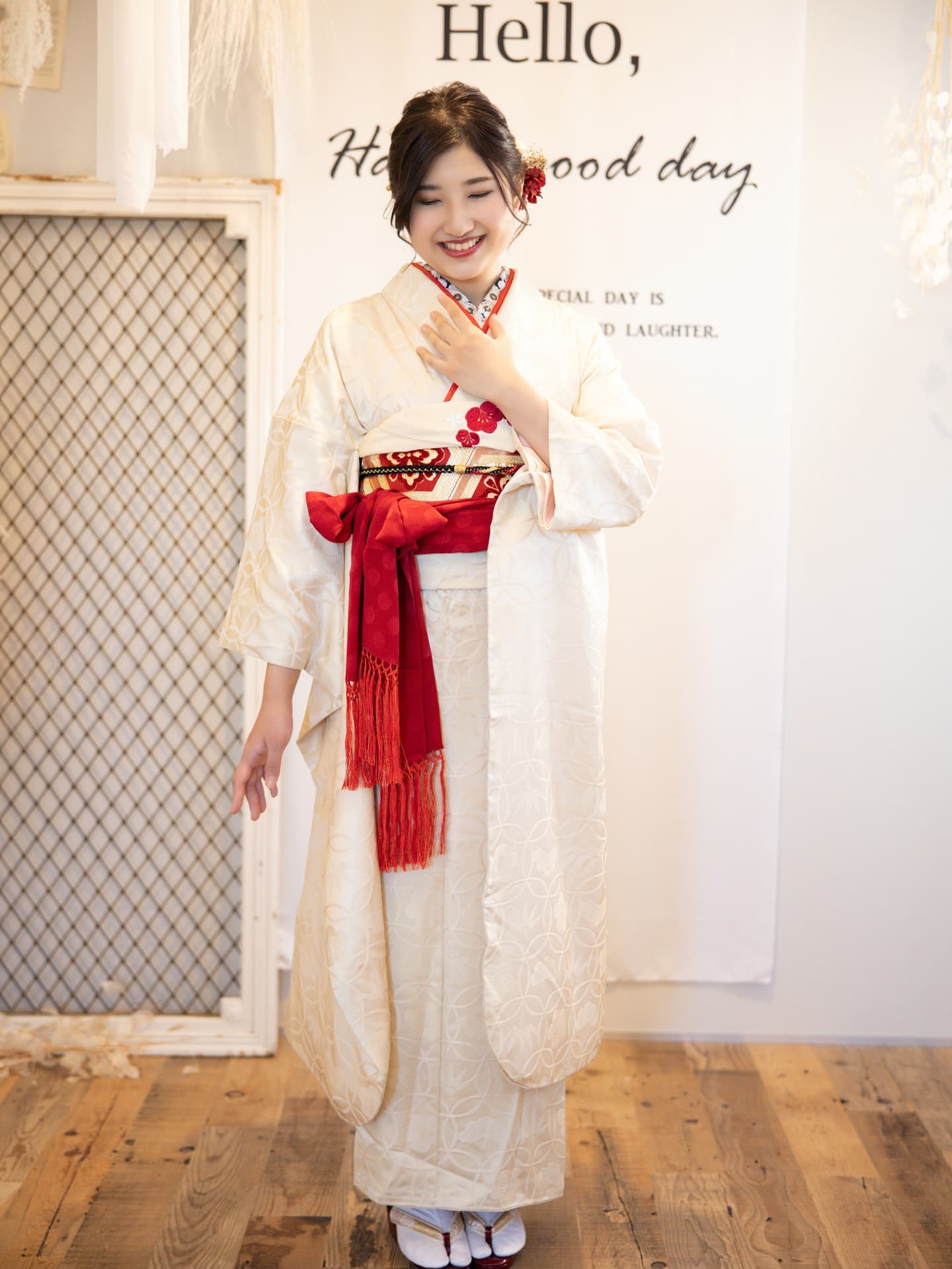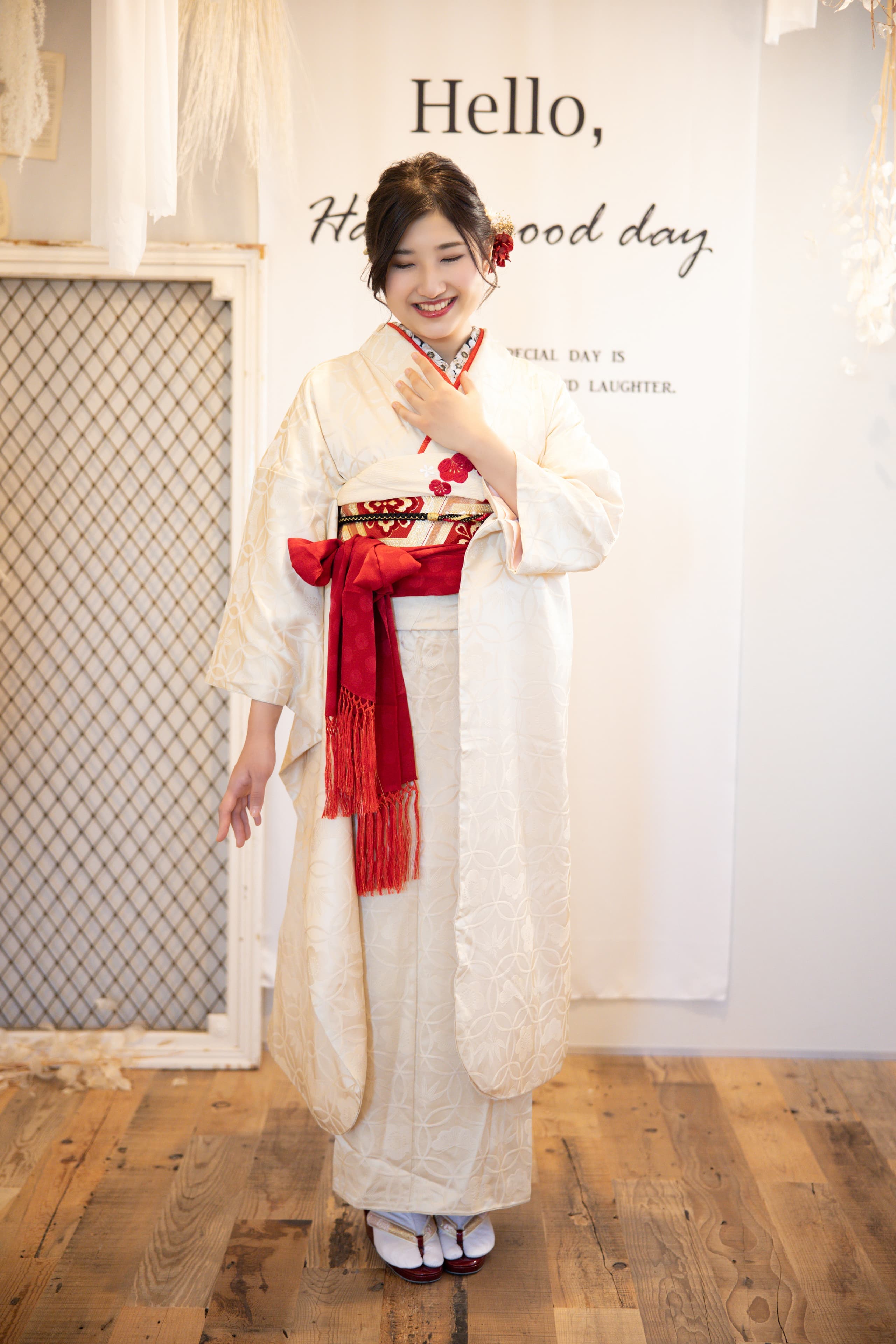 撮影プランのお打ち合わせ後、撮影となります。着付けなどのオプションをご希望の場合は+30分〜かかります。撮影後はお写真をご覧いただきご清算にて終了となります。